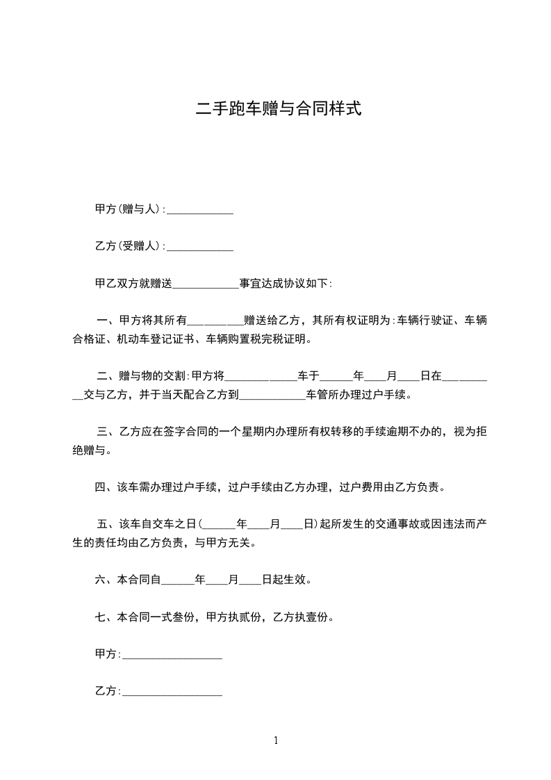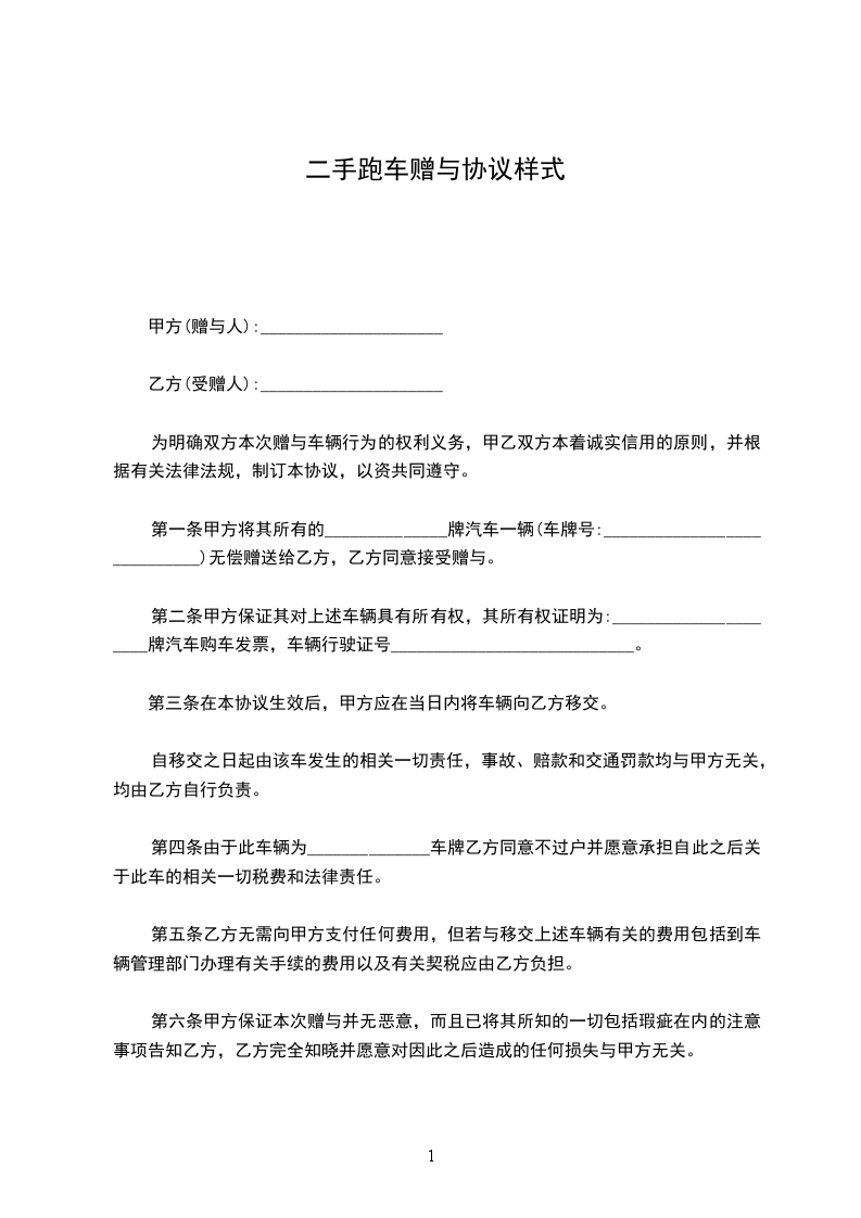 第一条甲方将其所有的____________牌汽车一辆(车牌号:________________)无偿赠送给乙方,乙方同意接受赠与。