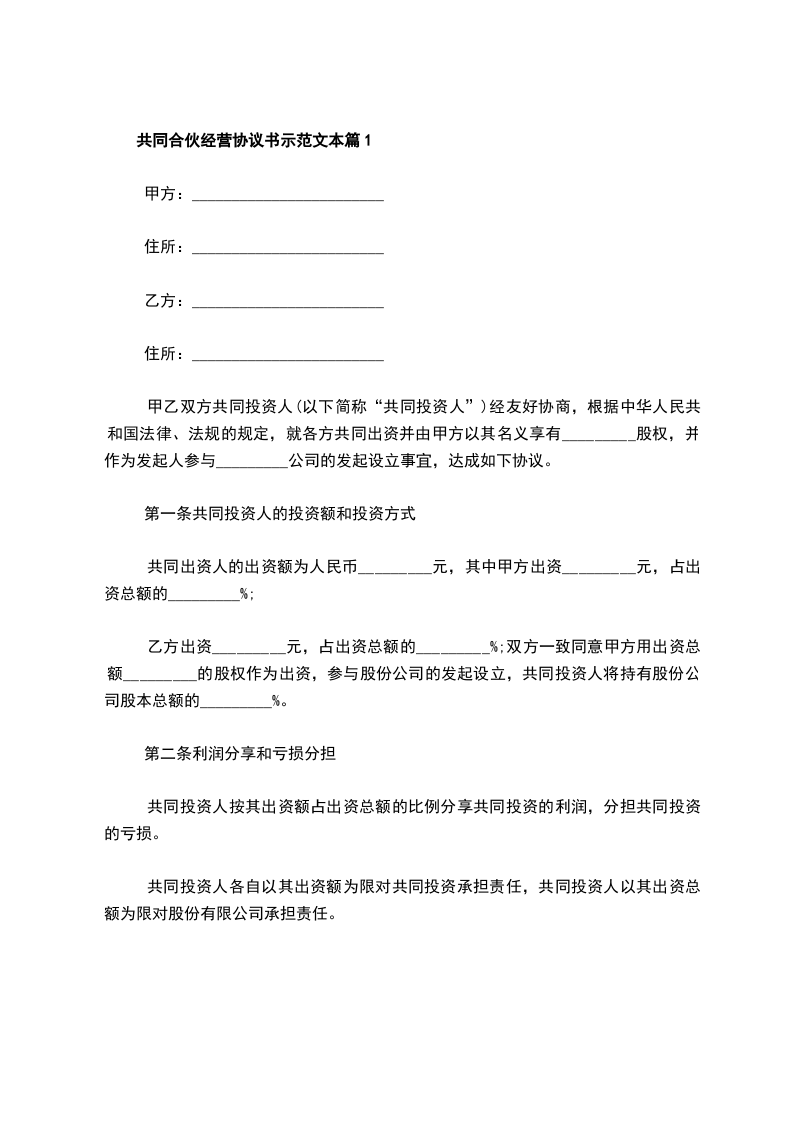 2024年共同合伙经营协议书示范文本篇1