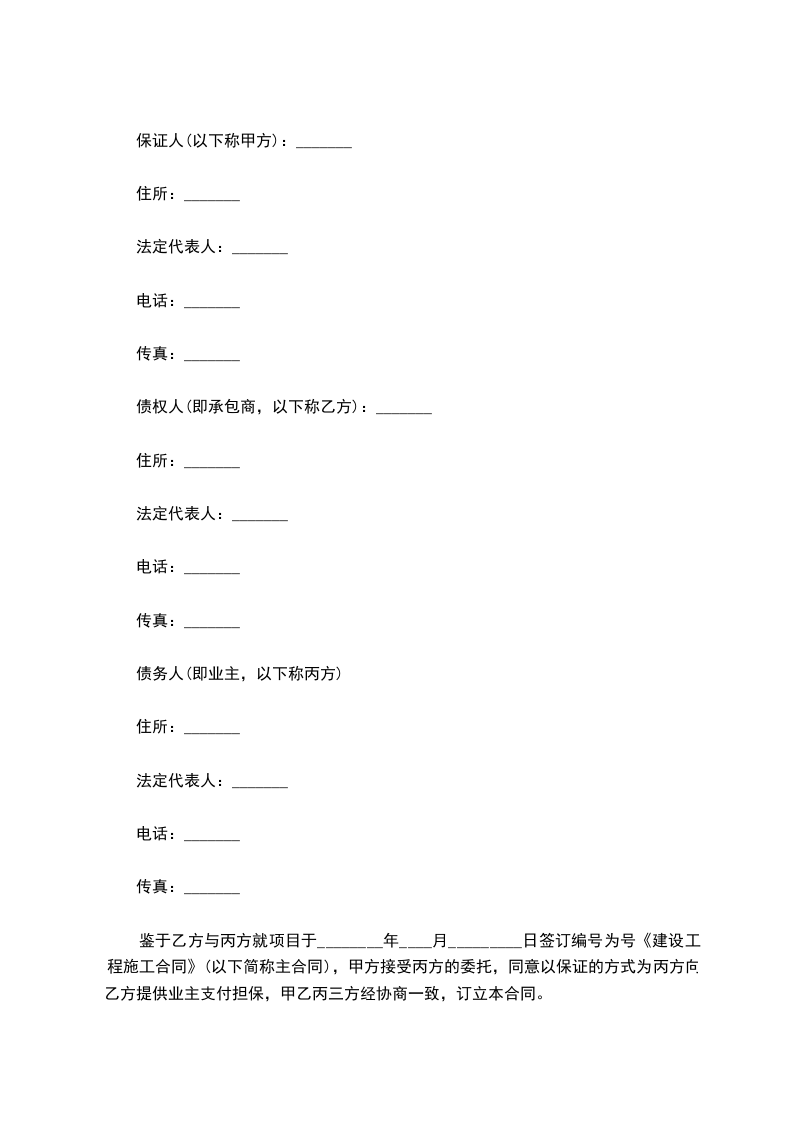 鉴于乙方与丙方就项目于________年____月____日签订编号为号《建设工程施工合同》(以下简称主合同),甲方接受丙方的委托,同意以保证的方式为丙方向乙方提供业主支付担保,甲乙丙三方经协商一致,订立本合同。