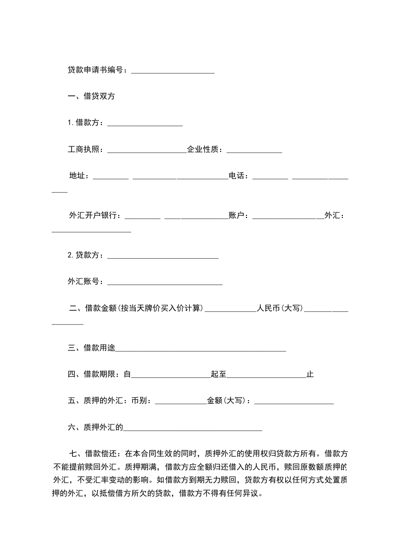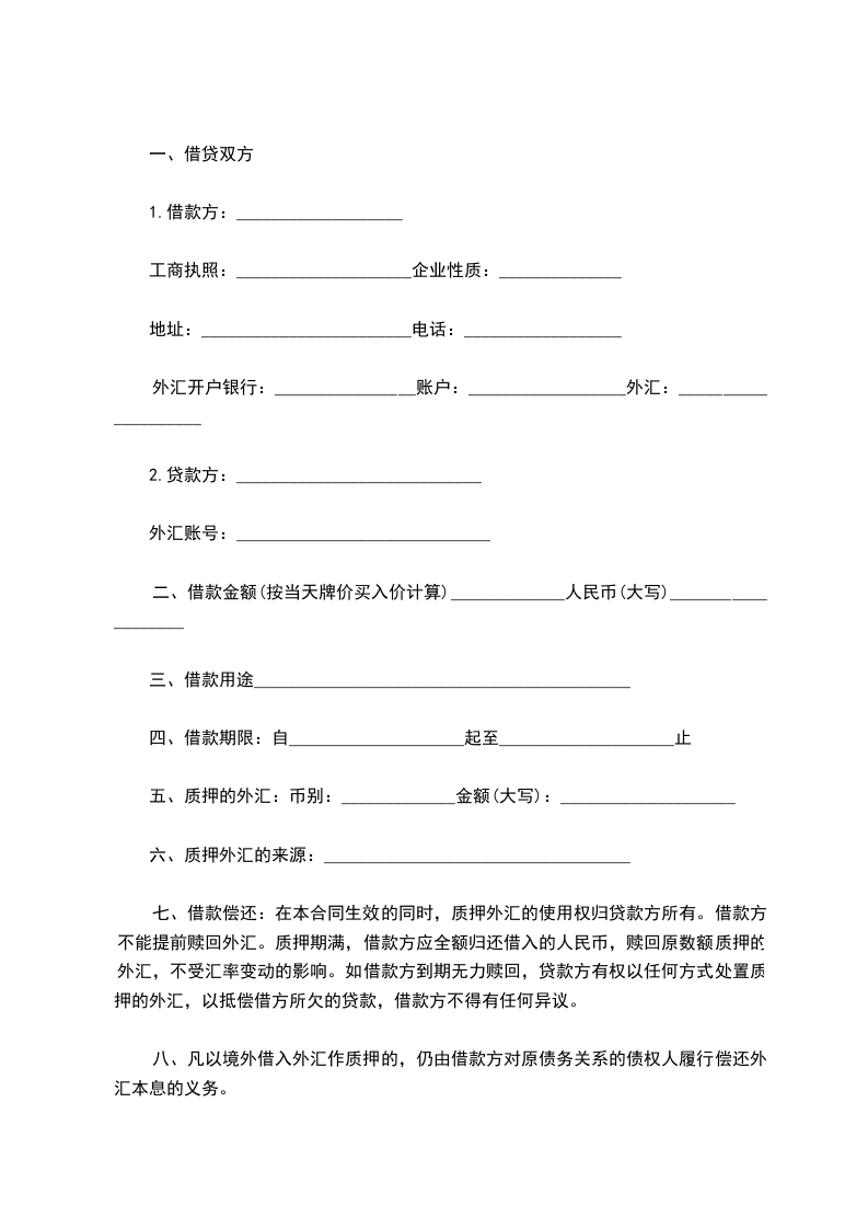 七、借款偿还:在本合同生效的同时,质押外汇的使用权归贷款方所有。借款方不能提前赎回外汇。质押期满,借款方应全额归还借入的人民币,赎回原数额质押的外汇,不受汇率变动的影响。如借款方到期无力赎回,贷款方有权以任何方式处置质押的外汇,以抵偿借方所欠的贷款,借款方不得有任何异议。