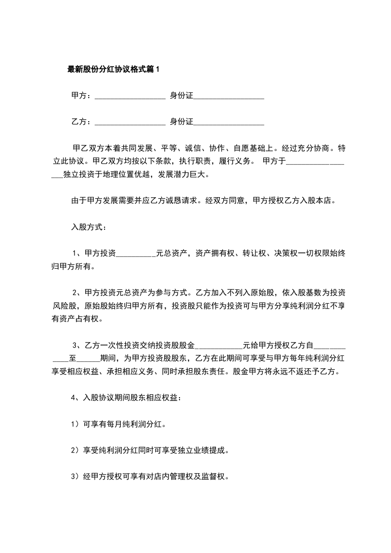 最新股份分红协议格式篇1
