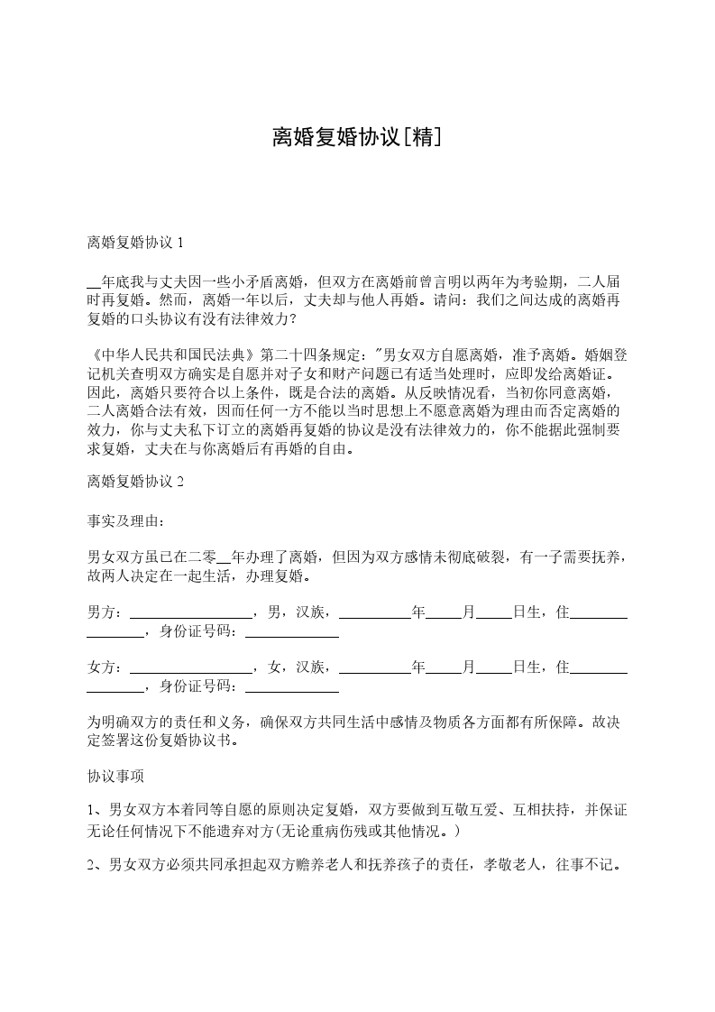 1、男女双方本着同等自愿的原则决定复婚,双方要做到互敬互爱、互相扶持,并保证无论任何情况下不能遗弃对方(无论重病伤残或其他情况。)