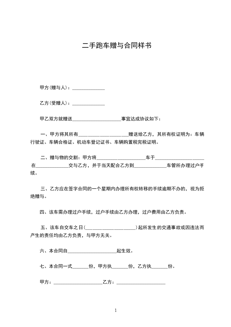 一、甲方将其所有__________赠送给乙方,其所有权证明为:车辆行驶证、车辆合格证、机动车登记证书、车辆购置税完税证明。