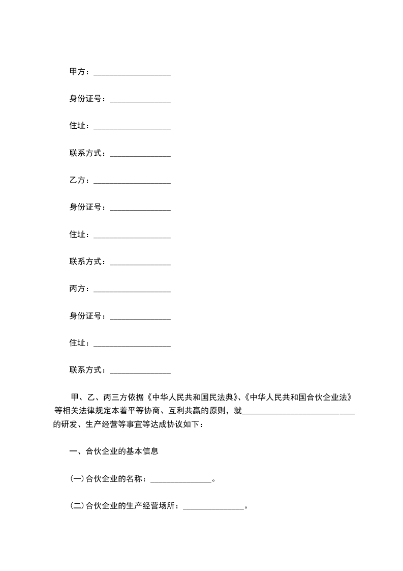 甲、乙、丙三方依据《中华人民共和国民法典》、《中华人民共和国合伙企业法》等相关法律规定本着平等协商、互利共赢的原则,就____________________________的研发、生产经营等事宜等达成协议如下: