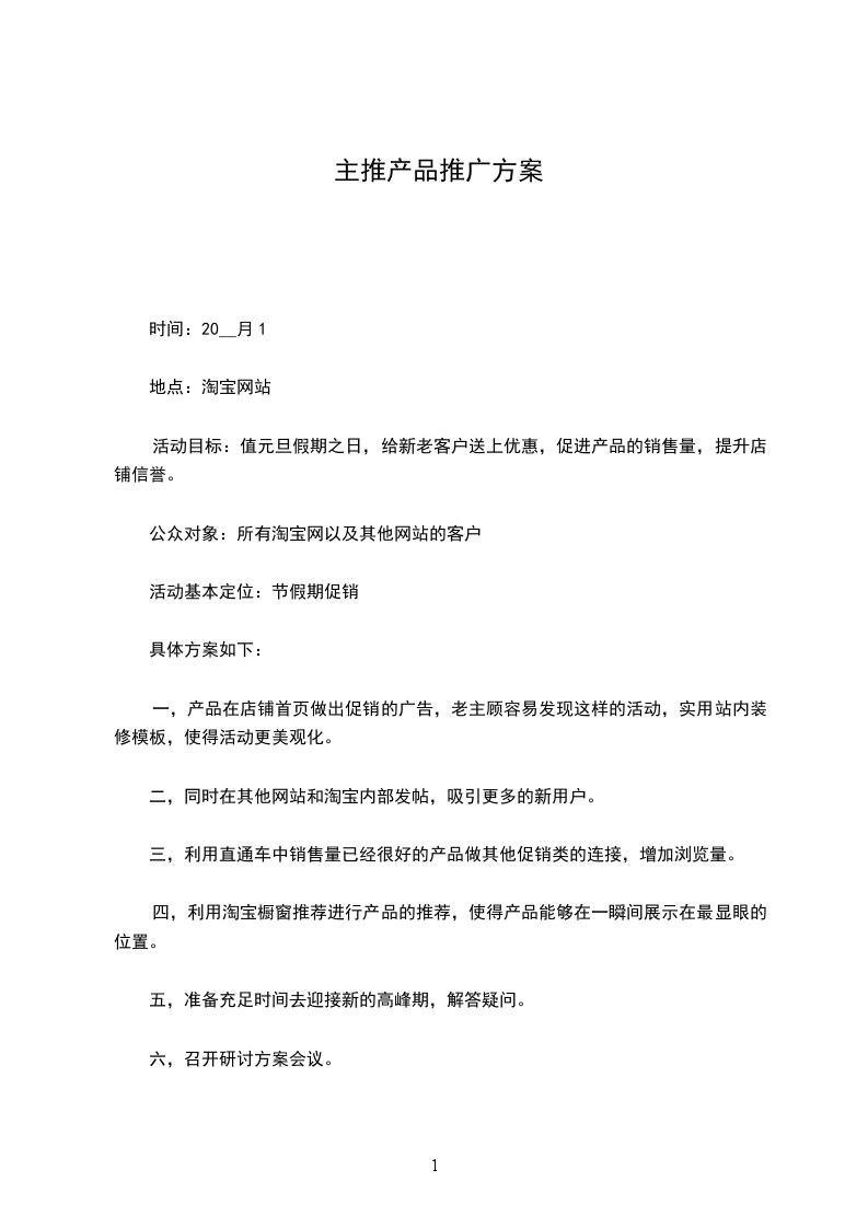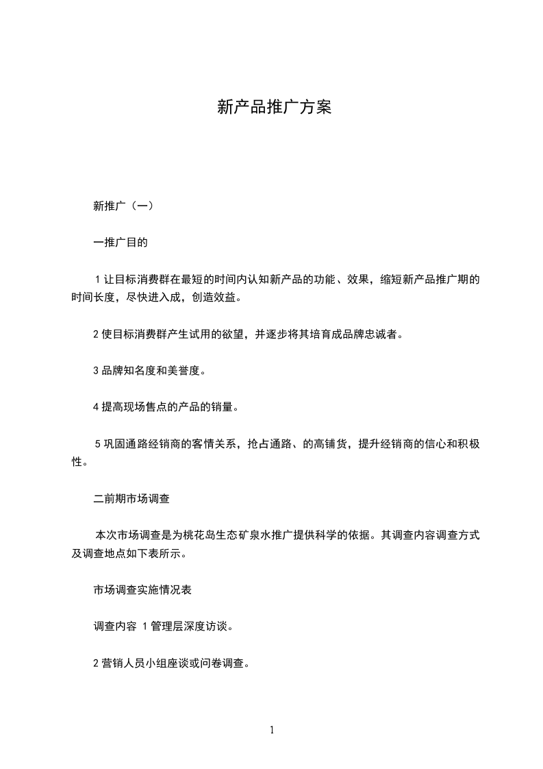 五、市场目标 短期目标(1-3月):新产品在投入市场初期在销量上应当会比较低,但我们可以通过广告促销来提高产品知名度和销量,让初期销量提升到1万份/月。 中期目标(1年):中期在产品有肯定知名度时,在连续做广告的同时,我们还要拓宽我们的销售渠道,借此来提升销量,让销量提升到3万份/月。 长期目标(1-5年):在销量达到3万份/月后我们要拓展广西市场,在广西各地级市推广销售我们的产品,最终让销量提升到40万份/月。