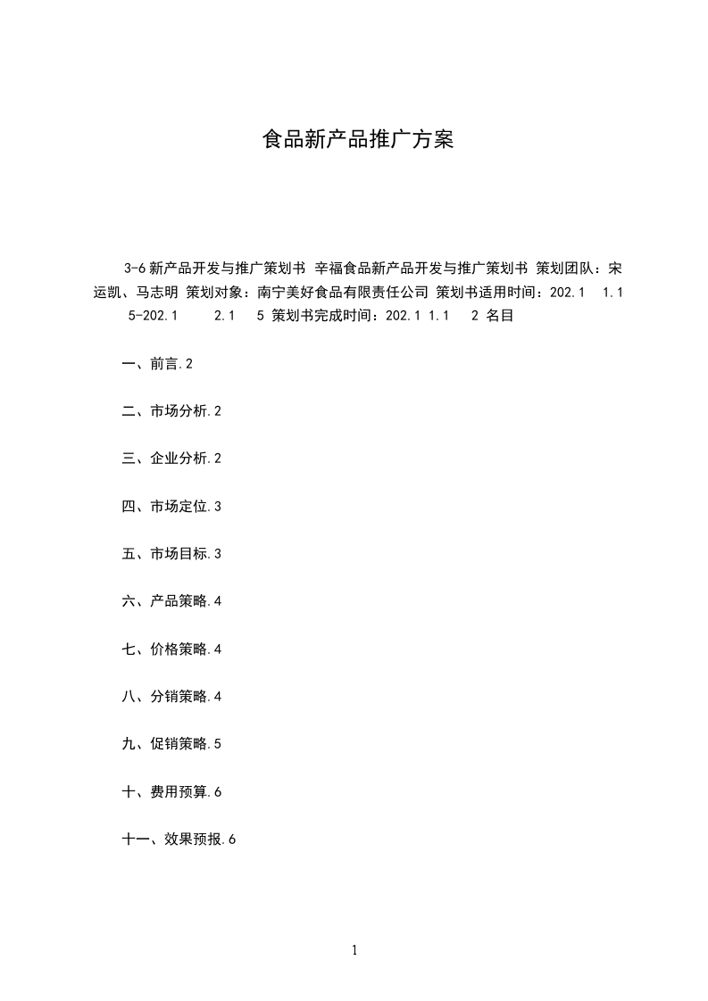3-6新产品开发与推广策划书 辛福食品新产品开发与推广策划书 策划团队:宋运凯、马志明 策划对象:南宁美好食品有限责任公司 策划书适用时间:202.1 1.1 5-202.1 2.1 5 策划书完成时间:202.1 1.1 2 名目