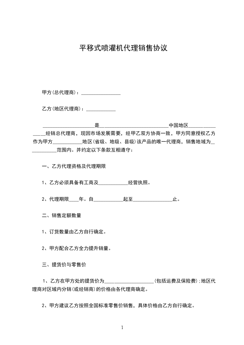 _____________________是____________________________中国地区________________经销总代理商,现因市场发展需要,经甲乙双方协商一致,甲方同意授权乙方作为甲方____________地区(省级、地级、县级)该产品的唯一代理商,销售地域为____________范围内。并约定以下条款互相遵守: