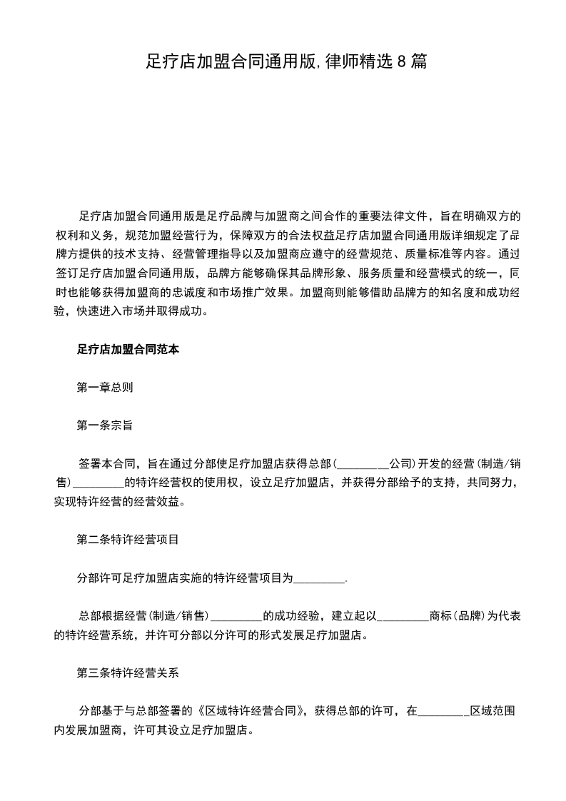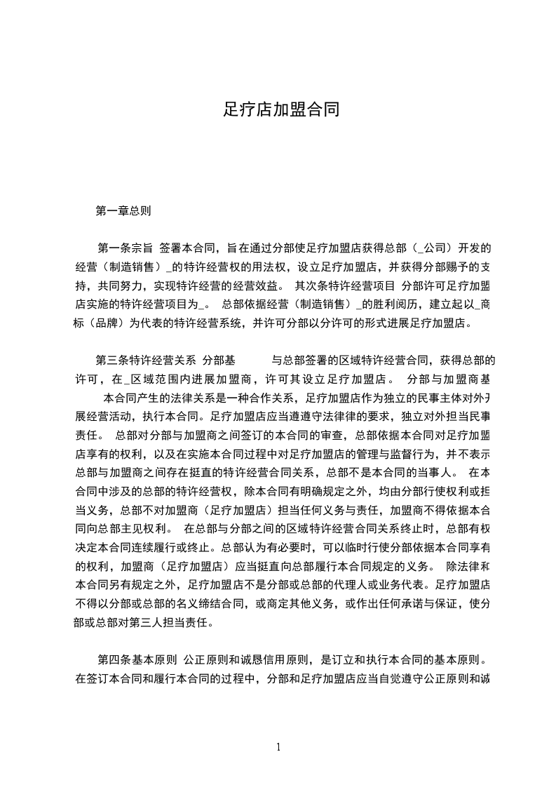 第一条宗旨 签署本合同,旨在通过分部使足疗加盟店获得总部(_公司)开发的经营(制造销售)_的特许经营权的用法权,设立足疗加盟店,并获得分部赐予的支持,共同努力,实现特许经营的经营效益。 其次条特许经营项目 分部许可足疗加盟店实施的特许经营项目为_。 总部依据经营(制造销售)_的胜利阅历,建立起以_商标(品牌)为代表的特许经营系统,并许可分部以分许可的形式进展足疗加盟店。