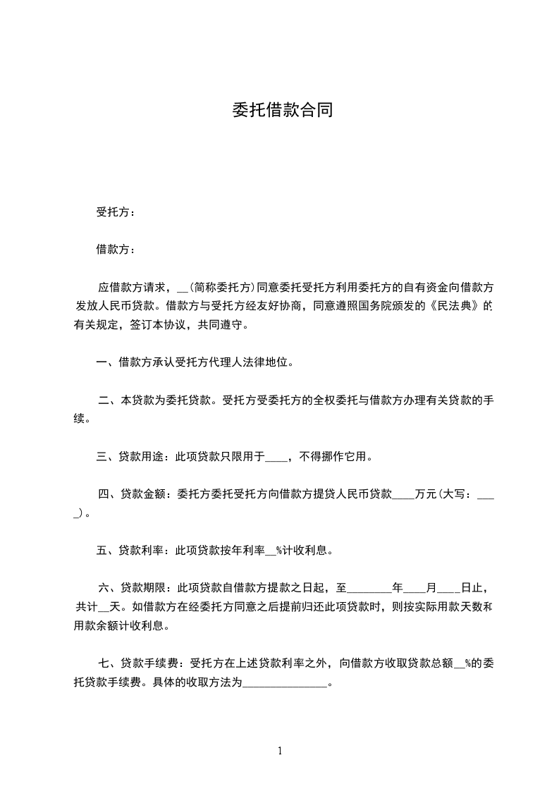 应借款方请求,__(简称委托方)同意委托受托方利用委托方的自有资金向借款方发放人民币贷款。借款方与受托方经友好协商,同意遵照国务院颁发的《民法典》的有关规定,签订本协议,共同遵守。