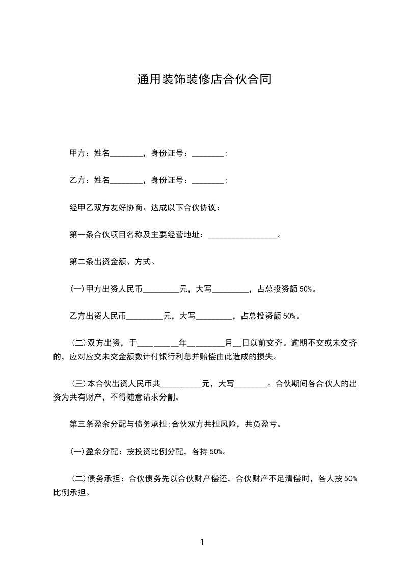 第三条盈余分配与债务承担;合伙双方共担风险,共负盈亏。