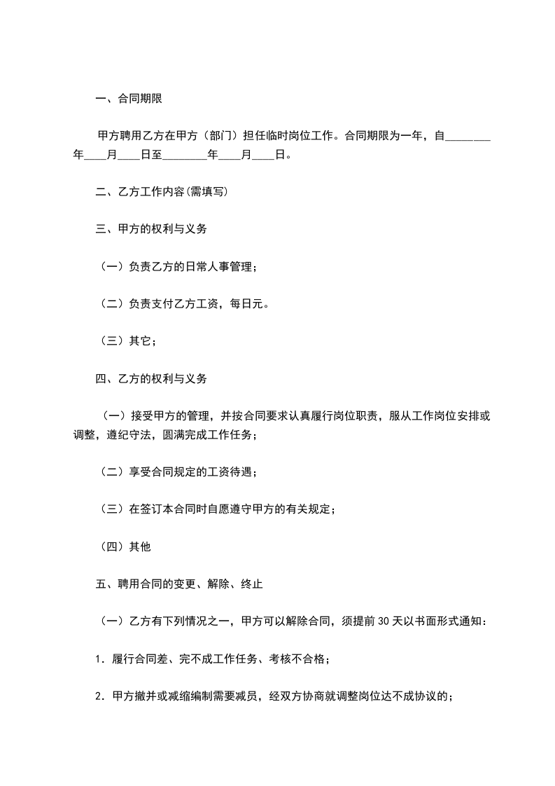 甲方聘用乙方在甲方(部门)担任临时岗位工作。合同期限为一年,自________年____月____日至________年____月____日。
