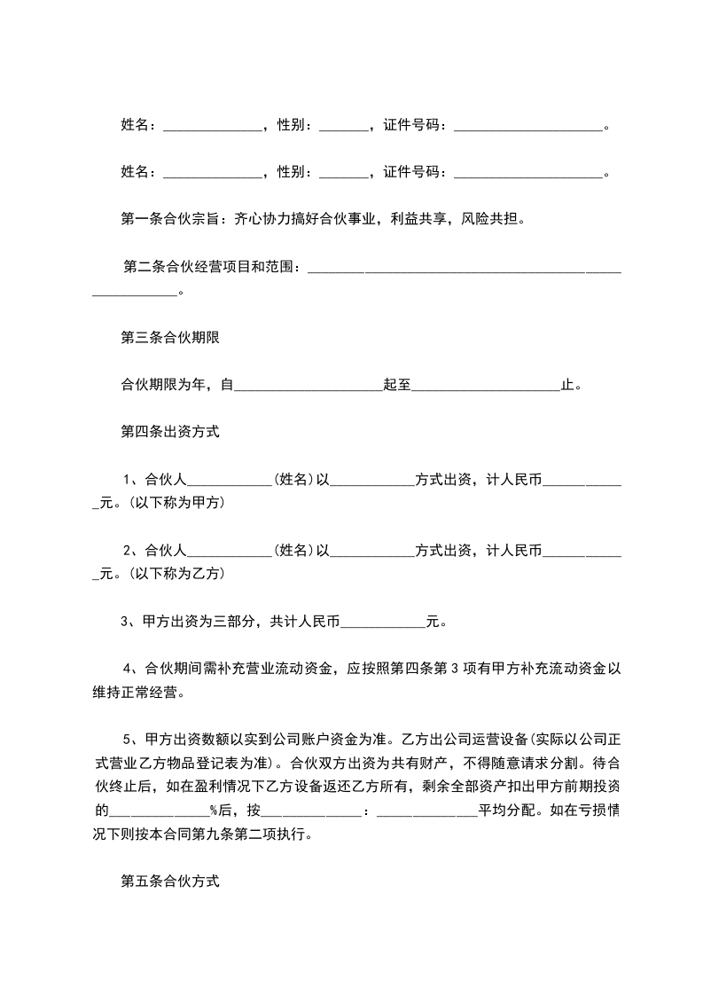 2、合伙人____________(姓名)以____________方式出资,计人民币____________元。(以下称为乙方)