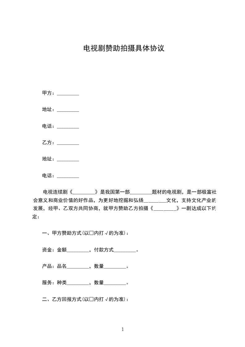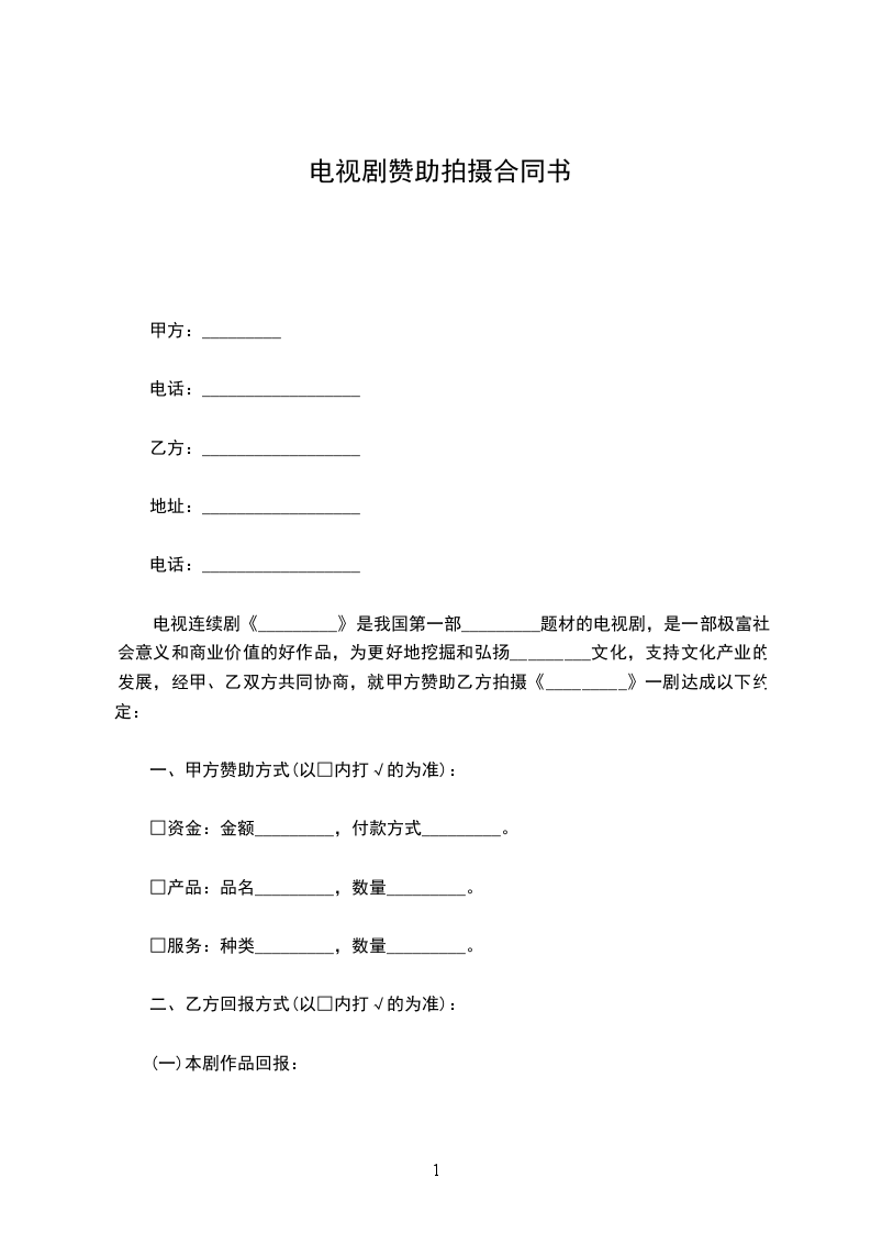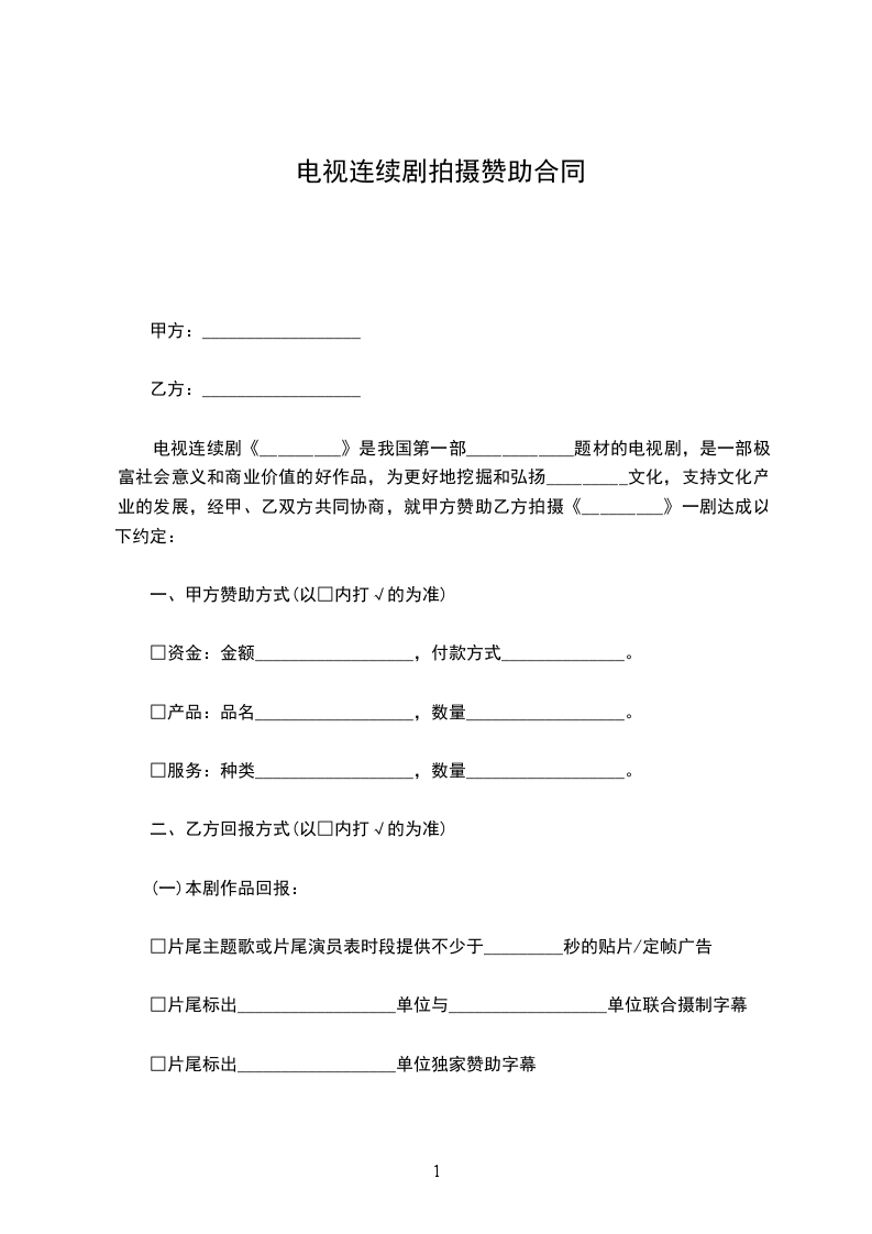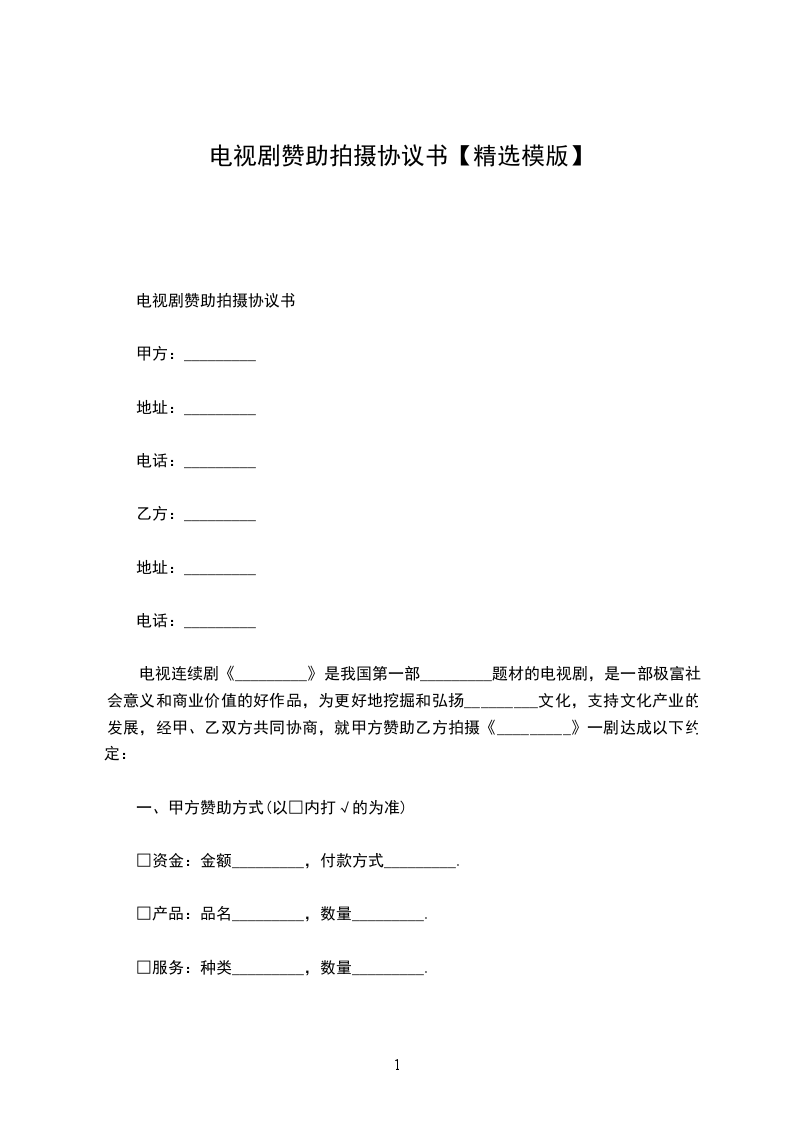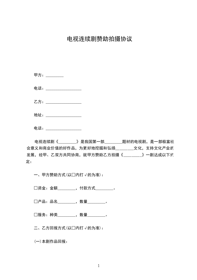 电视连续剧《_________》是我国第一部____________题材的电视剧,是一部极富社会意义和商业价值的好作品,为更好地挖掘和弘扬_________文化,支持文化产业的发展,经甲、乙双方共同协商,就甲方赞助乙方拍摄《_________》一剧达成以下约定: