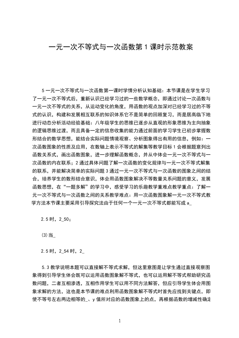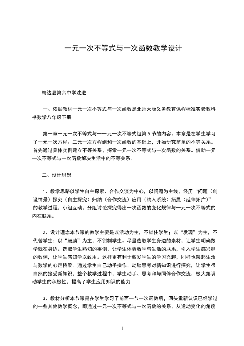 5一元一次不等式与一次函数第一课时学情分析认知基础:本节课是在学生学习了一元一次不等式后,重新认识已经学习过的一些数学概念,即通过讨论一次函数与一元一次不等式的关系,从运动变化的角度,用函数的观点加深对已经学习过的不等式的认识,构建和发展相互联系的知识体系它不是简单的回顾复习,而是居高临下地进行动态分析活动经验基础:八年级学生的思维已逐步从直观的形象思维为主向抽象的逻辑思维过渡,而且具备一定的信息收集的能力通过前面的学习学生已初步掌握数形结合的数学思想,能结合实际问题情境观察、分析图象得出有用的信息,例如:一次函数图象的性质及应用,在数轴上表示不等式的解集等教学目标1会根据题意列出函数关系式,画出函数图象,进一步理解函数概念,并从中体会一元一次不等式与一次函数的内在联系;2通过具体问题了解一次函数的变化规律与一元一次不等式解集的联系,并能解决简单的实际问题3通过一元一次不等式与一次函数的图象之间的结合,培养学生的数形结合意识,体会用函数图象解决不等数量关系问题的意义,发展函数思想,在“一题多解”的学习中,感受学习的乐趣教学重难点教学重点:了解一元一次不等式与一次函数之间的关系教学难点:用一次函数图象解一元一次不等式教学方法本节课主要采用引导探究法由于任何一个一元一次不等式都能写成a_