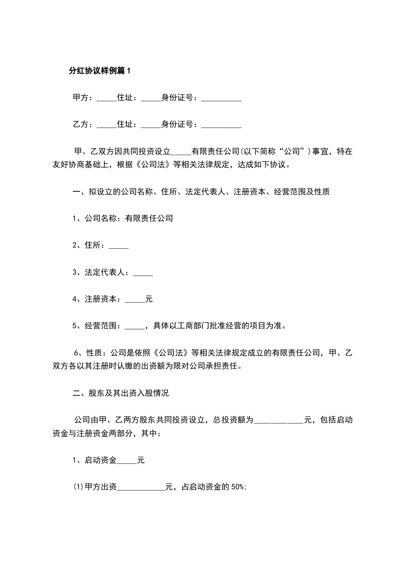 分红协议样例篇1