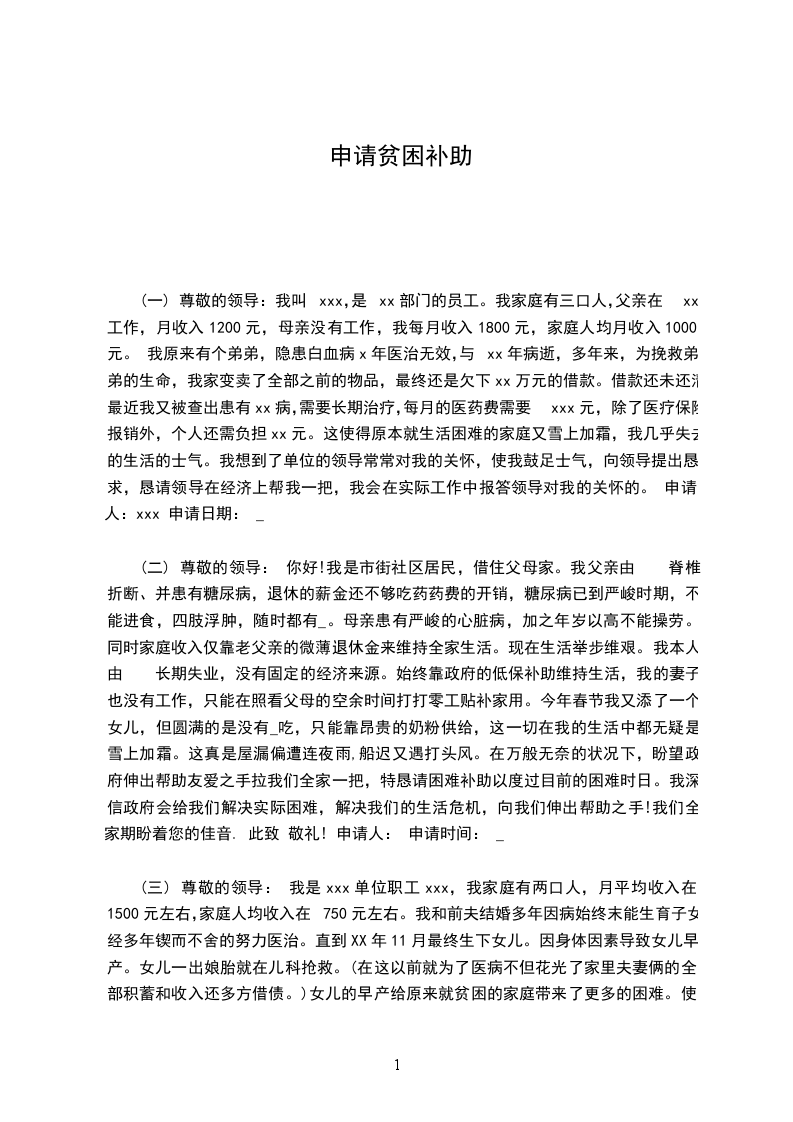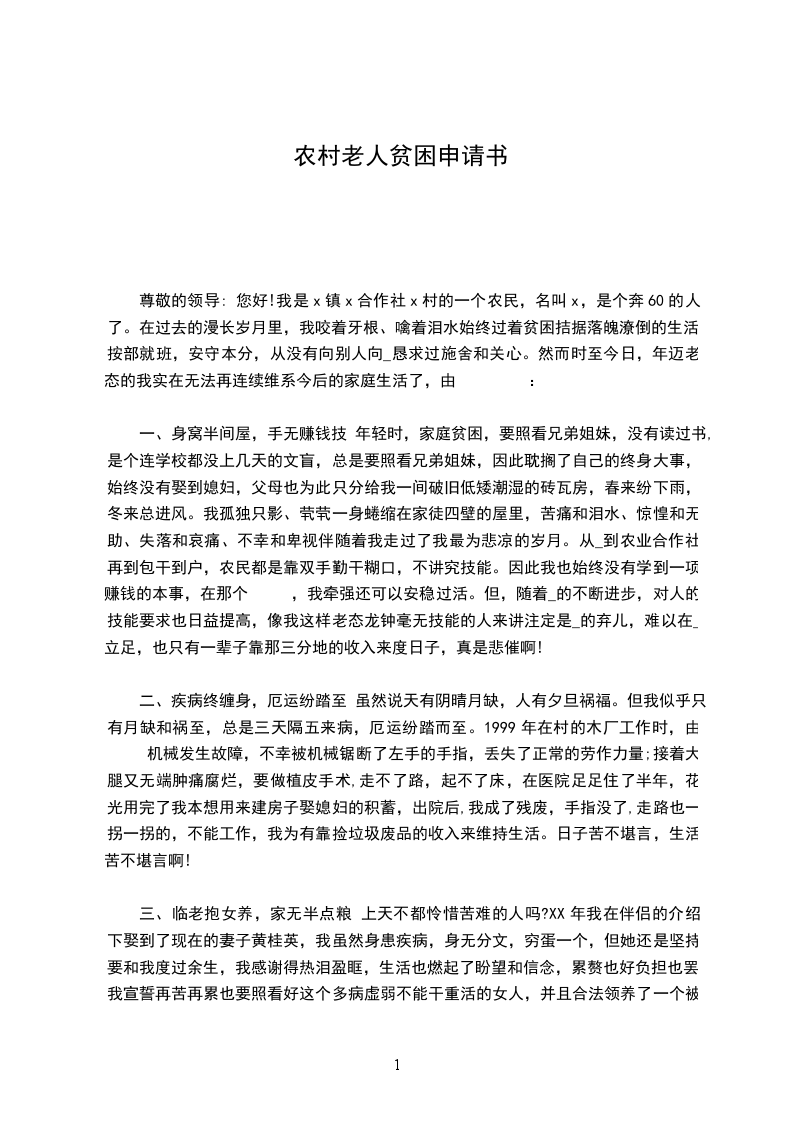 尊敬的各位领导: 我叫,今年刚好31岁,小一职称。从XX年开头进入训练界现今已有十载余。在这十年的时间里,我始终坚持着心中的做人幻想,奋斗在乡村训练的前沿。虽然物价飞涨的 ,工资显得很微薄,生活也不是很富足(好像老师的工资从来都没有那么富足过),然而,只要还站在讲台,还坚守教室,我就没有任何理由漠视在教室里坐着的几十个鲜活的生命的成长和进展,就无法漠视自身生命的开掘与燃烧。 我有一个贫瘠和美好美满的家庭,工作每日在生活的重压下困难而又坚韧的与无情的命运抗争着。老公和我一家三口在外人的眼里是美好的,是美满的,可是真实的状况却远远非外人所能想象。自从我嫁到现在的这个家庭,我的生活就彻彻底底的转变了。老公的家庭状况并非外人想象的那样和谐富足,在开头的时候我们也会为柴米油盐而犯愁,我的婆婆在老公高中求学的时候就落下了终生的偏瘫,这个家庭为治疗我婆婆的病当年欠下了巨额的外债和人情债,当我和现在的老公走到一起的时候才知道我面临现实 (文章转自有用文档频道XX09) 的残酷和白手起家的不易。 许多时候想起过放手,想起过将来的艰涩,可是看着心爱的孩子,我的心就软了,跟着这样的家庭我还有再选择的余地吗?!眼看着外面的世界,学校的同事每每我不能不怨老天的不公,老公的人生基础太差,婚姻是女性的其次次投胎,可我投对了吗?在心中不止一次的问过自己。和老公几年的打拼,日子慢慢有了起色,可是生活的境况和现实的残酷更是让我们始料未及的。在老公家,我是儿媳,孝敬公公婆婆自然不用说,在娘家我也是妈妈的心头肉啊。由 我的父母都是农民,没有多少生活的收入来源,父亲八九年前从西安出了一次工伤事故回来后,手脚从那以后就不太灵活了,大脑反应也时时有些迟缓跟不上生活的节拍。母亲在训练战线上奉献了三十多年,可到头来却是一个民办老师的宿命。我和老公结婚后除了生活的开销用几年的时间还请外债外,还得供给弟弟的高校生活学费。XX年通过省吃俭用不断的压缩家庭开支我们最终还请了外债和把我的弟弟从高校供给了出来。弟弟这几年自己在南京给人打工我们在今年通过东拼西凑和我家人又给他们买房做了很多的付出,而我和老公的生活现在却还是困难的在人生的道路上跋涉着,为自己活着,是一种自由;为他人和家庭_活着,是一种责任。为了弟兄姊妹都好好的活着,我们又被生活压重了稚嫩的肩膀。老公是通情达理的,生活虽然苦点,但我们还是坚韧的笑对着人生,笑对着将来一切的人生困苦。 假如这个_还有真情,假如这个国家还有大爱,假如这个民族还有点血性,假如我们的训练工天生就该默守清贫,我们这个国家民族如何走上训练的辉煌走上_的公正正义呢?!关爱弱势群体,共建和谐大爱世界,请组织真真正正的拿出我们的良心笑赢天下的弱者吧。只要人人都献出一点爱,我想我们的世界在将来肯定会成为爱的海洋。 申请人: XX-10-09