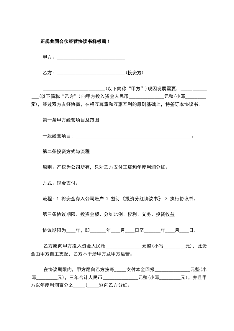 乙方愿向甲方投入资金人民币_______________元整(小写_________元),此资金由甲方自主支配,乙方不干涉甲方及甲方运营。