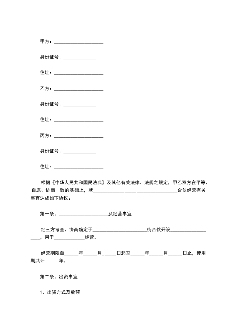 根据《中华人民共和国民法典》及其他有关法律、法规之规定,甲乙双方在平等、自愿、协商一致的基础上,就___________________________________合伙经营有关事宜达成如下协议: