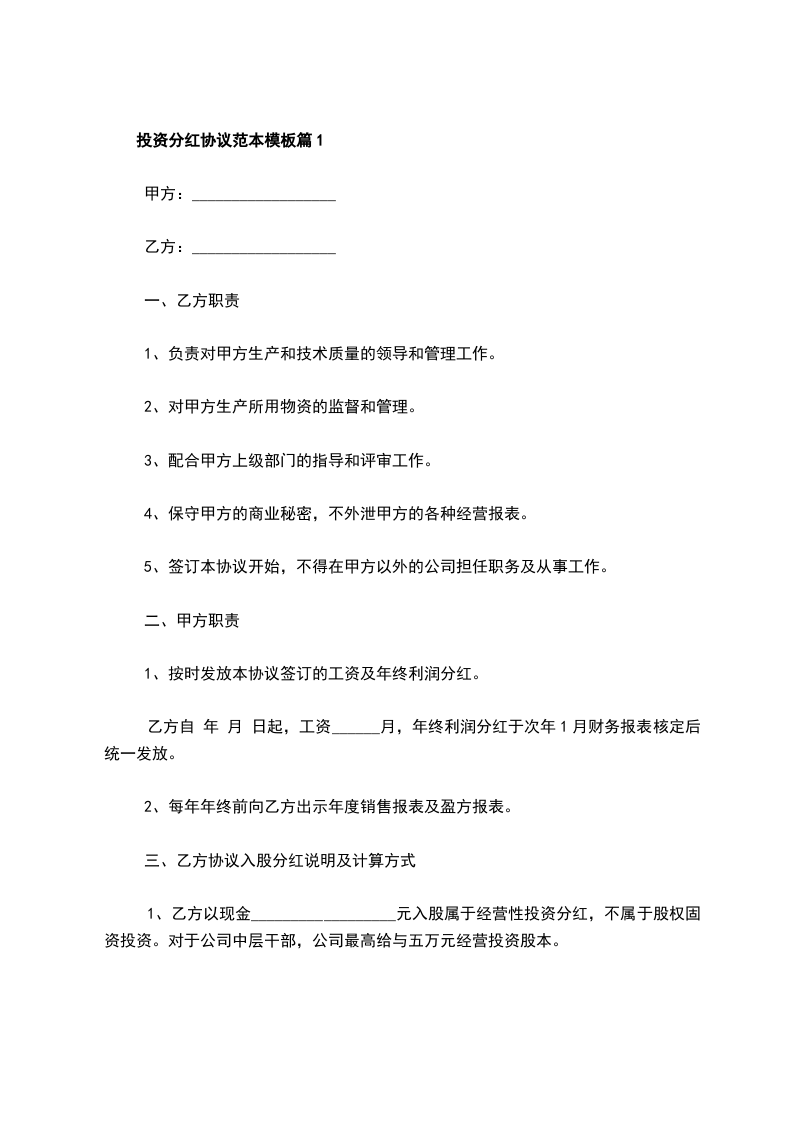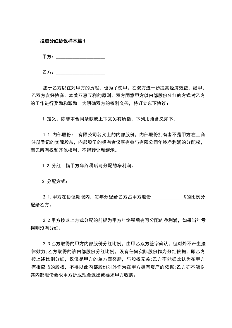 投资分红协议范本模板篇2