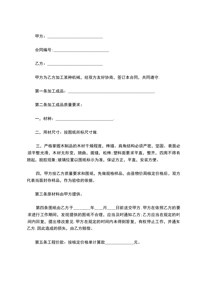 六、乙加工所需要的车床、量具、刀具、夹具、检验设备等其他设备均有乙自己购置,如需甲代制作、代购,乙需按照甲合理提出的价格等金额的支付。甲目前提供的车床从_________月_________日起终止。乙加工所需的原材料有甲提供,乙加工后的副产物(铁屑、铝屑等)由乙作为乙成本计入利润进行核算。