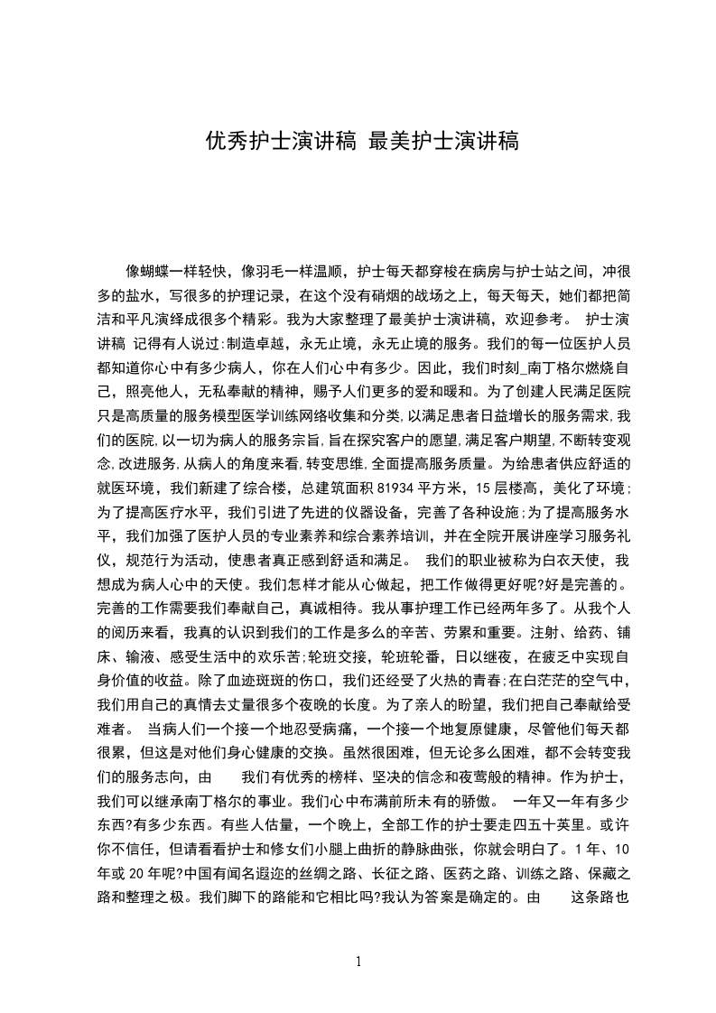 八、双五服务,以及星级护理服务等。不断加强护理队伍建设,完善护理质量管理工作流程,落实抢救及特别大事报告处理制度和护理紧急风险预案,建立了护理质量追踪机制;重视健康训练,实行出院病人回访制;在创新中完善管理,以科研促进服务进步。从而使护理工作紧跟时代进展需求,很好地满足了临床医疗需求和人民群众日益增长的服务需要。 岁月轮回,光阴荏苒,回首从护的日夜兼程,品读着生命的春华秋实,曾经年少时的漂亮向往历历在目,信任每一位护士都有不同的感慨。作为在医院熔炉中渐渐成长起来的我,多年在历练深深地体会到:护理工作在苦累中体现价值,在详情中描绘高尚,在医学训练网搜集整理琐粹中铸造辉煌。虽然护士工作三班倒没有节假日,常常加班加点,身体透支;常常由 不能一语道破而患病白眼,甚至无缘无故被当成出气筒,多年以后才明白,当个天使太不简单,白衣天使的翅膀太沉重了,左边背着爱心和真诚,右边驮着微笑和奉献,用辛勤的汗水一笔笔描绘着青春的痕迹。这种执着将会使我们终身受益,选择当护士,无怨无悔!当有人问我的职业时,我会骄傲的说:我是一名护士。 可爱、单纯、漂亮的青春岁月不知道什么时候就从忙劳碌碌的手指间溜走了。记不起从什么时候开头,学会了容忍、学会了爱护,学会了处事不惊,学会了许很多多。人在成熟中变得简单,简单之后的我好像对好多事情变得理性。每天都要面对那么多的生离死别,有时候我都在想自己会不会还有泪流。有人说,或许是由 长年工作的紧急把_消磨殆尽了,而护士姐妹们却一如既往地渴望用柔弱的双肩扛起重任,繁重的护理工作憔悴了她们的容颜,然而护士姐妹们每天都对生活与工作布满了_!面对着病人的误会依旧微笑着,渴望用微笑和真诚搭起护患之间的信任,一次次从死神手里夺下鲜活的生命,再苦再累依旧悄悄无闻地工作!病人无医,将陷 无望;病人无护,将陷 无助。这是我国首位南丁格尔奖得主王琇瑛的话,让我们将爱置 心,辛勤工作,努力不让病人陷入无助的境地。愿天使们的逝去青春能换回患者康复的笑靥,我们将连续与病人的生命同行,让病人因我们的悉心护理而削减苦痛,因我们的耐烦指导而有所收获,因我们的真心劝慰而树立信念。因我们的真诚微笑而健康欢乐。 护士演讲稿 有一种职业,没有经受过就不知道它的艰辛。有一种艰辛,没有体会过就不知道它的欢乐。有一种欢乐,没有品尝过就不知道它的味道。 这就是护士,阳光下最平凡、最平淡、最单调的职业。爱在左,怜悯在右,走在生命的两旁,随时撒种,随时开花,将这一径长途,点缀得花香充满,使穿杖拂叶的行人,踏着荆棘,不学得苦痛,有泪可落,却不悲凉。多少护士同仁为这种护士职业的最高境界献出了毕生的精力。 立德为医,修业济人;救死扶伤,无私奉献。在这种良好的医院文化的熏陶下,一代又一代的护士传承着历代阳医人严谨治学,勤奋务实的医者作风,全力以赴为阳新人民供应优质的护理服务。_的进展,医学模式的转变,阳新县人了医院的护理工作从80 三化病房的建设,责任制护理,到90 的整体护理以及现在的人性化护理管理模式,护理工作发生了前所未有的有改变。格外是近几年来,从建章建制、完善质量检查标准开头,一步一个脚印,坚持病人至上,质量第一,卓越服务,持续改进的质量管理理念,构建了严谨的规范的护理管理体系,与时俱进开展了各项优质护理服务,如先后开展了五心服务、双