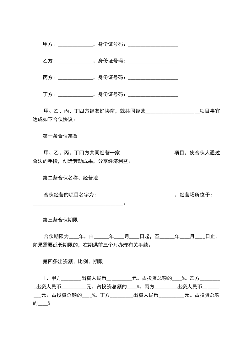 甲、乙、丙、丁四方经友好协商,就共同经营_____________________项目事宜达成如下合伙协议: