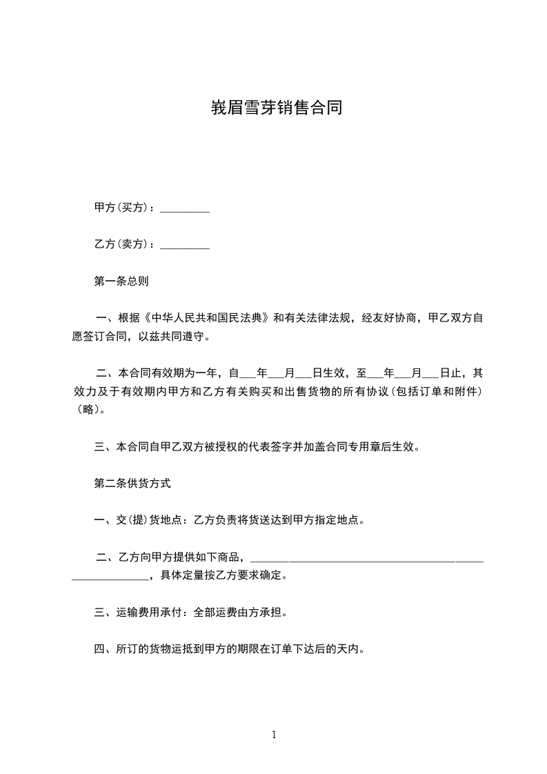 二、本合同有效期为一年,自___年___月___日生效,至___年___月___日止,其效力及于有效期内甲方和乙方有关购买和出售货物的所有协议(包括订单和附件)(略)。