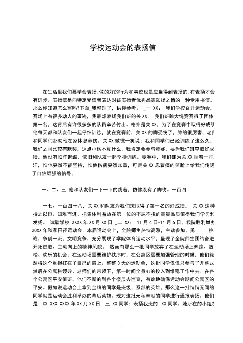 十七、一百四十八,关XX和队友为我们班取得了第一名的好成绩。 关XX这种持之以恒、知难而进、把集体利益放在第一位的不屈不挠的高贵品质值得我们学习和发扬。 试验学校 XXXX年XX月XX日 _二 XX: 11月4日-11月6日,我院胜利举办20XX年秋季田径运动会。本届运动会上,全院师生热忱高涨,主动参加,勇 挑战,争创一流,文明竞争,充分展现了学院体育运动水平,呈现了全院师生团结奋进、开拓进取、主动向上的精神风貌。 然而有那么一批同学放弃了在运动场上奔跑、放松、欢乐的机会,在运动场需要维护秩序时,在公寓区需要加强管理的时候,他们毅然将这个重担扛在了自己的肩上。整整3天的运动会,这批同学仅仅只参与了开幕式,然后在公寓科领导、老师们的带领下,第一时间全身心的投入到维稳工作中去。在各个公寓区平安值班,他们不断的到各个楼层去巡查,有效地确保运动会期间公寓区的平安。假如说运动会上拿到金牌的同学是班级、系部的英雄,那么这一批悄悄无闻的同学就是运动会胜利举办的幕后英雄。现对这批无私奉献的同学进行通报表扬。他们是:XX XXX XXXX年XX月XX日 _三 XX同学: 表扬我班的XX同学。她所在的小组在昨天的羽毛球竞赛中获得了第一名的优异成绩。 逢打必胜,战无不胜,大获全胜。虽然她在场上的时间很短暂,但她的身影依旧停留在人们的脑海里,由 她是赛场上最可爱的人。不为掌声和鲜花,不为刻意的制服,不为饼干和火腿肠,她心中坚决的信念,脚下沉稳的步伐只是为了用行动告诉人们一个不变之理,没有走不完的路,没有过不了的山,只要用那坚韧的意志去努力,胜利就能属 你。 坚决,执着,耐力与盼望,在延长的羽毛球馆中点点分散!力气,信念,拼搏与奋斗,在跳动的身影上慢慢光明!时代的强音正在她的脚下踏响。她的每一次挑衅,都叩动着我们的心弦;她的每一次吐槽,都吸引着我们的视线;她的每一次完胜,都绷紧我们的神经。 青春的脚步,青春的速度,青春的活力,青春的_,在她的身上尽情体现。迎接自我,挑战自我,战胜自我,人们信任她肯定能行。 XXX XXXX年XX月XX日