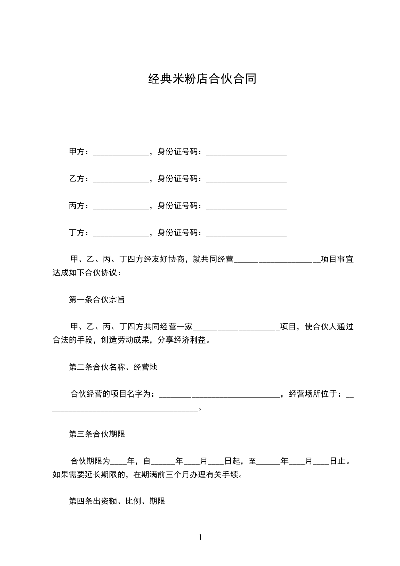 甲、乙、丙、丁四方经友好协商,就共同经营_____________________项目事宜达成如下合伙协议: