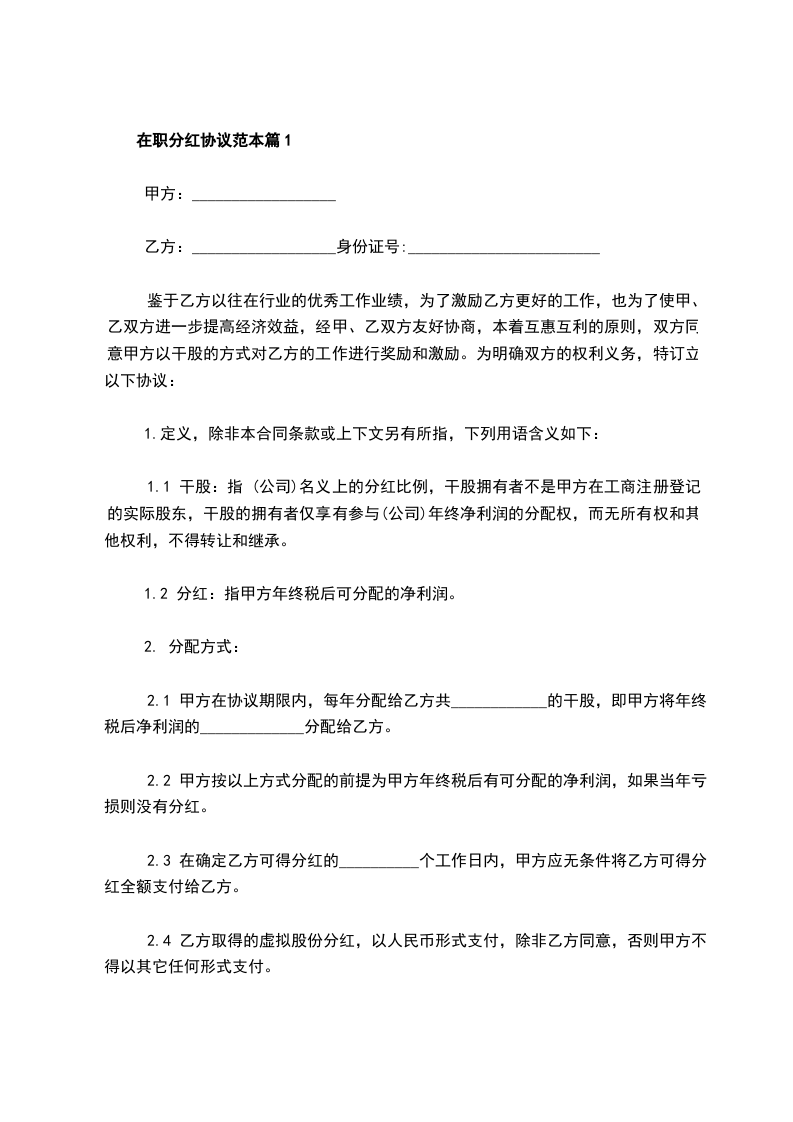 鉴于乙方以往对甲方的贡献,也为了使甲、乙双方进一步提高经济效益,经甲、乙双方友好协商,本着互惠互利的原则,双方同意甲方以内部股份分红的方式对乙方的工作进行奖励和激励。为明确双方的权利义务,特订立以下协议: