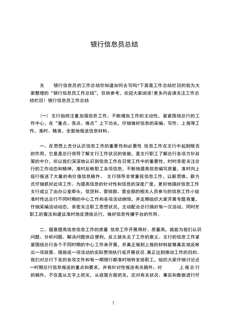 关 银行信息员的工作总结你知道如何去写吗?下面是工作总结栏目的我为大家整理的“银行信息员工作总结”,仅供参考,欢迎大家阅读!更多内容请关注工作总结栏目! 银行信息员工作总结