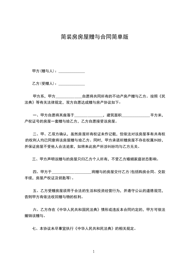 第一条:甲方自愿将位于______________________________的房产赠与给乙方,乙方自愿接受该房屋;赠与不附加任何条件,赠与完成后该房产为乙方个人财产。