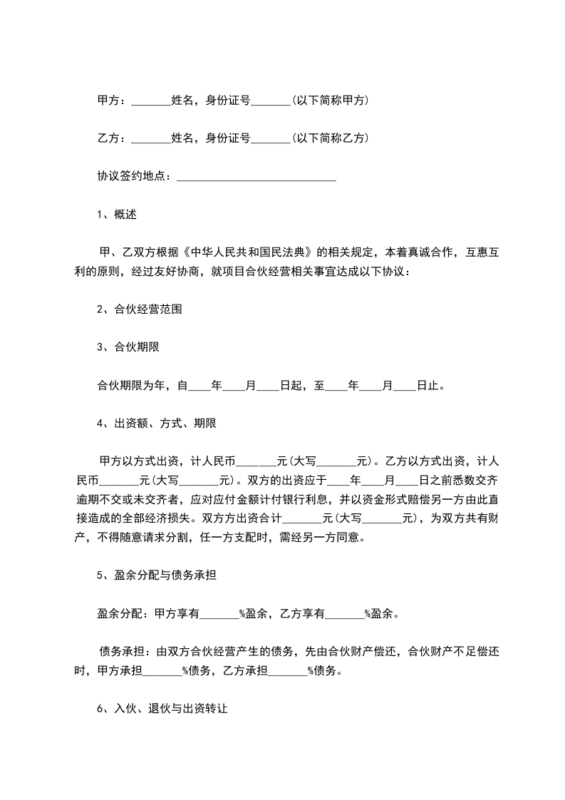 甲、乙双方根据《中华人民共和国民法典》的相关规定,本着真诚合作,互惠互利的原则,经过友好协商,就项目合伙经营相关事宜达成以下协议:
