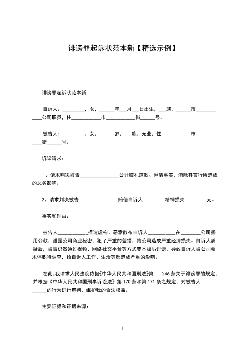 在此,我请求人民法院依据《中华人民共和国刑法》第246条关于诽谤罪的规定,并根据《中华人民共和国刑事诉讼法》第170条和第171条之规定,对被告人____________的行为进行审判,维护我的合法权益。