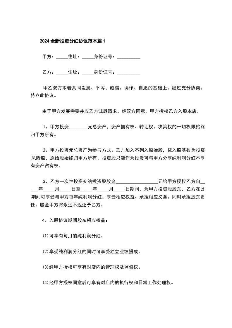 3、乙方一次性投资交纳投资股股金__________________元给甲方授权乙方自_____年_____月_____日至_____年_____月_____日期间,为甲方投资股股东,乙方在此期间可享受与甲方每年纯利润分红。享受相应权益、承担相应义务、同时承担股东责任。股金甲方将永远不返还予乙方。