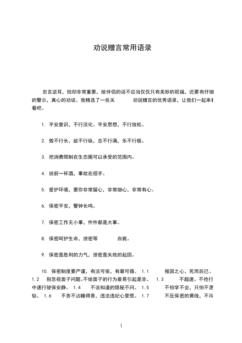 10. 保密制度要严谨,有法可依,有章可循。 1.1 报国之心,死而后已。 1.2 别忽视面子问题。不给面子的行为最易引起是非。 1.3 不超速、不抢行,中速行驶保安静。 1.4 不该知道的隐秘不问。 1.5 不怕学不会,只怕不愿钻。 1.6 不贪不沾睡得香,违法违纪心里慌。 1.7 不压保密的黄线,不闯保密的红灯,不走保密的禁行道。 1.8 不用民用电话、明码电报、一般邮局办理隐秘事项。 1.9 不准不根据规定程序推举、考察、酝酿、商量决定任免干部。