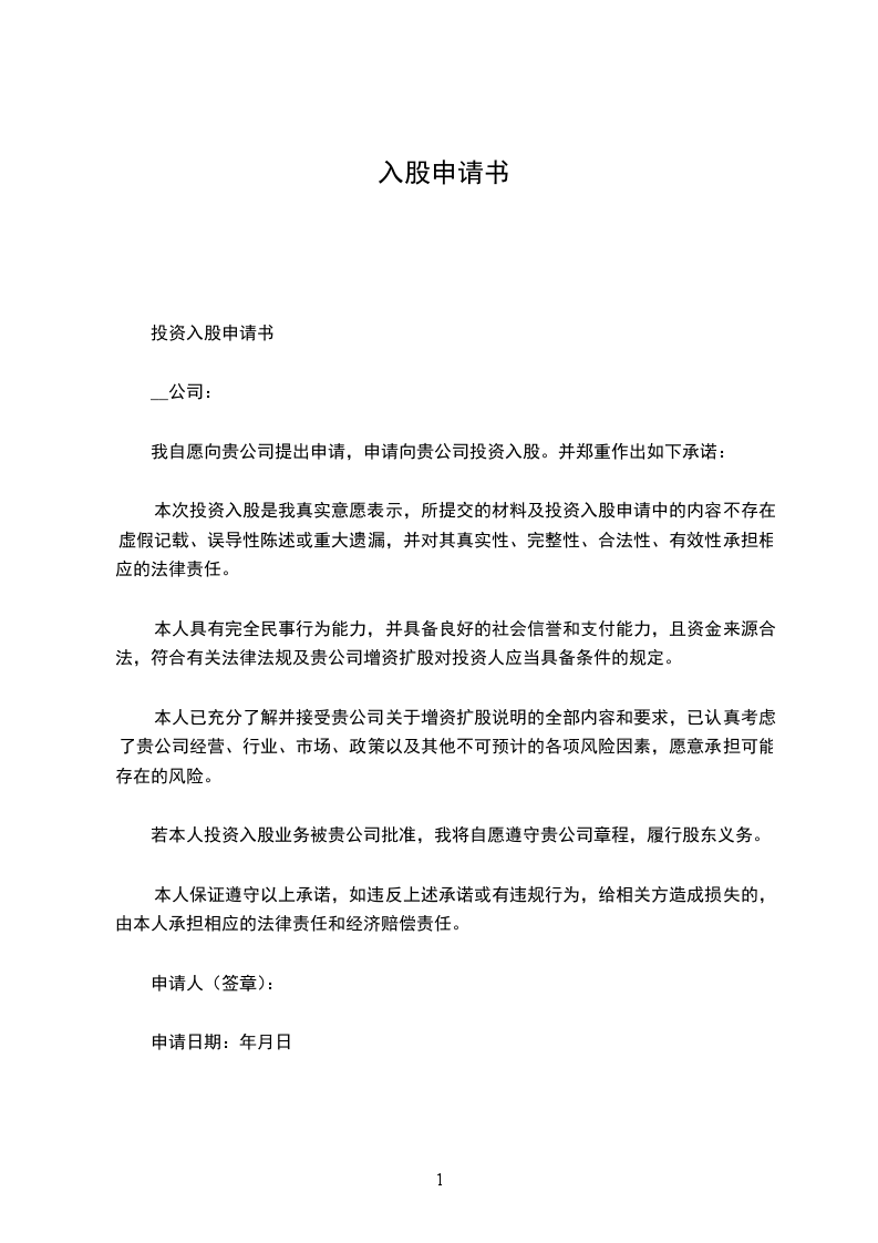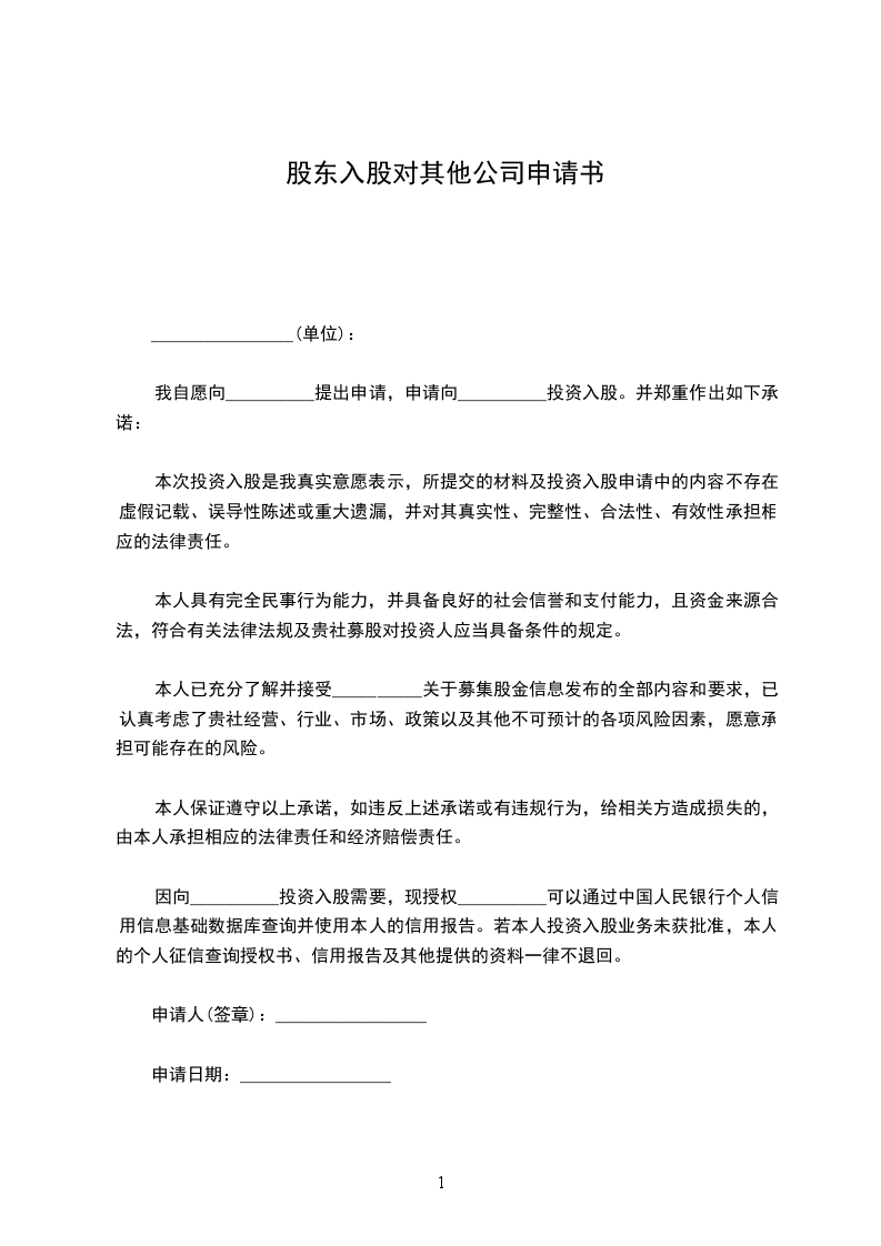 我自愿向__________提出申请,申请向__________投资入股。并郑重作出如下承诺: