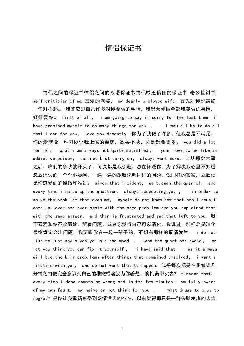 情侣之间的保证书情侣之间的双语保证书情侣缺乏信任的保证书 老公检讨书 self-criticism of me 友爱的老婆: my dearly b.eloved wife: 首先对你说最终一句对不起。 我答应过自己许多对你要做的事情,我想为你做全部我能做的事情,好好爱你。 first of all, i am going to say im sorry for the last time. i have promised myself to do many things for you, i would like to do all that i can for you, love you decently. 你为了我做了许多,但我总是不满足,你的爱就像一种可以让我上瘾的毒药,欲罢不能,总是想要更多。 you did a lot for me, b.ut i am always not quite satisfied, your love to me like an addictive poison, can not b.ut carry on, always want more. 自从那次大事之后,咱们的争吵就开头了,每次都是我引起,总在怀疑你,为了解决我心里不知道怎么消失的一个个小疑问,一遍一遍的跟我说明同样的问题,说同样的答案,之后便是你感受到的挫败和难过。 since that incident, we b.egan the quarrel, and every time i raise up the question. always suspecting you, in order to solve the prob.lem that even me, myself do not know how that small doub.t came up. over and over again with the same prob.lem and you explained that with the same answer, and then is frustrated and sad that left to you. 我不喜爱和你不欢而散,留着问题,或者你觉得自己可以消化,我说过,那样总是消化最终肯定会出问题,我要跟你在一起一辈子的,不想有那样的事情发生。 i do not like to just say b.yeb.ye in a sad mood , keep the questions awake, or let you think you can fix it yourself, i have said that, as it always will b.e the b.ig prob.lems after things that remained unsolved, i want a lifetime with you, and do not want that to happen. 似乎每次都是在我做错几分钟之内便完全意识到自己的稚嫩或者没为你着想,懊悔药哪买去? it seems that, every time i done something wrong and in the few minutes i am fully aware of my own fault. my naive or not think for you, what drugs to b.uy to regret? 是你让我重新感受到感情世界的存在,以前觉得那只是一群头脑发热的人为自己编造的世界,但自从有了你,一切都不一样了,世界好像都在我眼中变得不一样,一切由 有你。 情侣之间的保证书