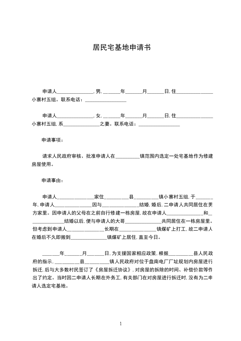 申请人_______________,女,_______年_______月_______日,住_______________小寨村五组,系_______________之妻。联系电话:_________________