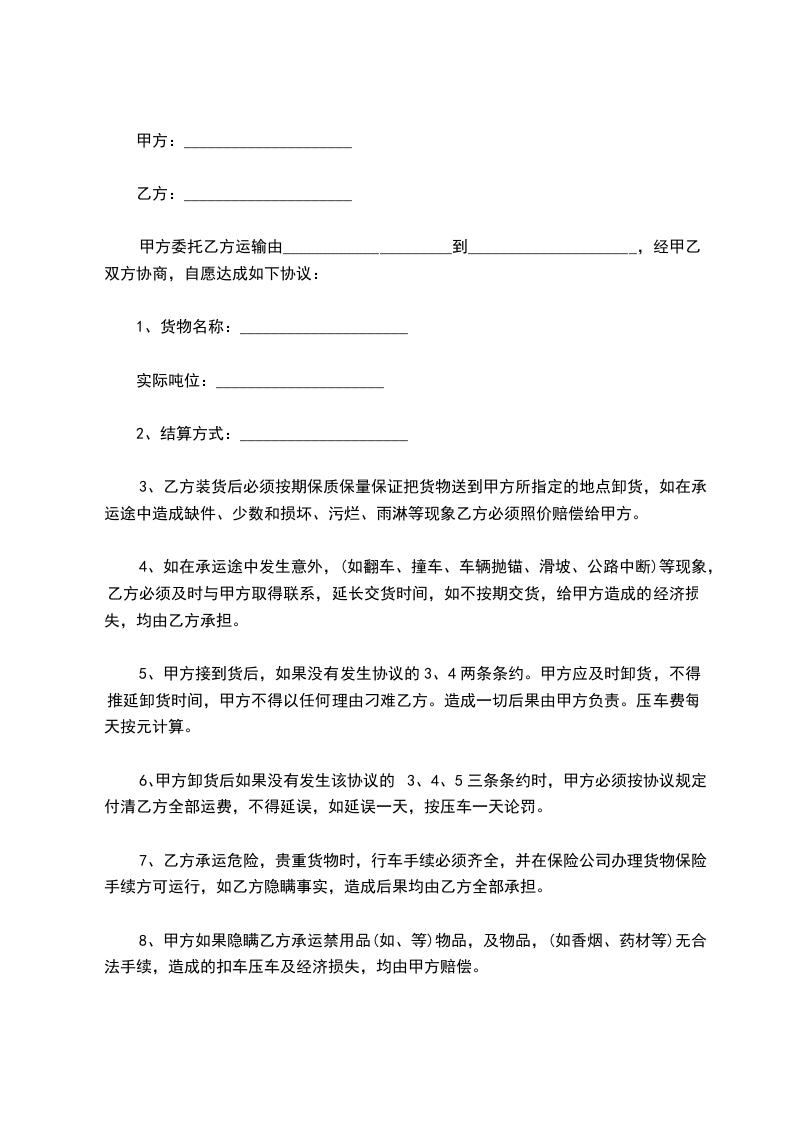 甲方委托乙方运输由_____________________到_____________________,经甲乙双方协商,自愿达成如下协议: