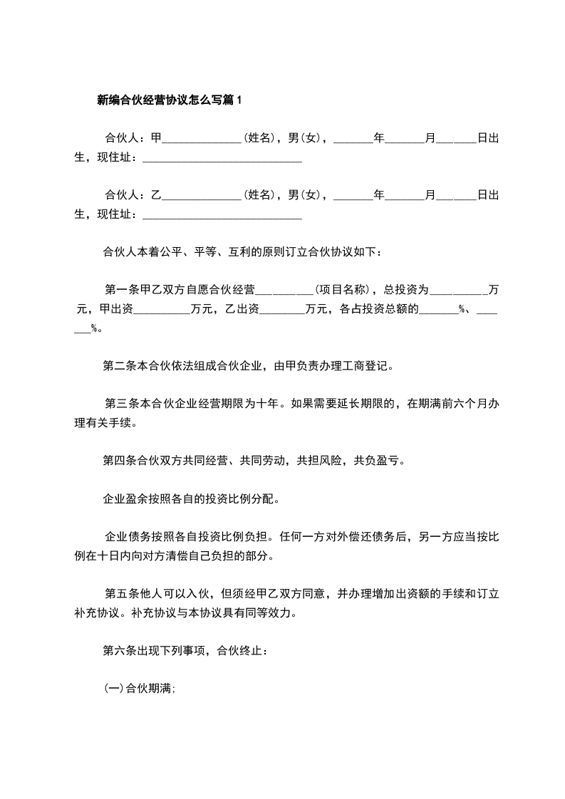 甲乙双方经充分协商,现就合伙经营事宜自愿达成如下协议: