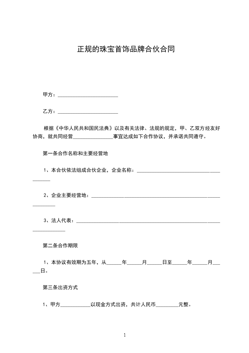 4、本合作出资共计人民币_________元整。合作期间各合伙人的出资为共有财产,不得随意请求分割,合作终止后,所有财产为各合伙人平分。