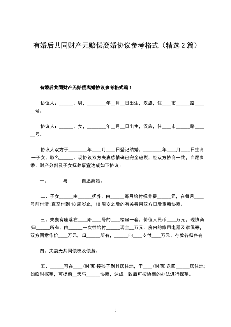 有婚后共同财产无赔偿离婚协议参考格式篇2