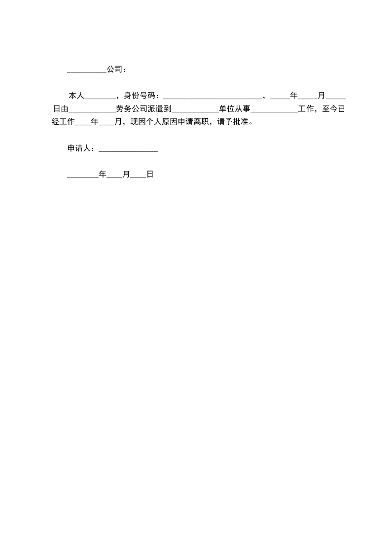 本人________,身份号码:_________________________,_____年_____月_____日由____________劳务公司派遣到____________单位从事____________工作,至今已经工作____年____月,现因个人原因申请离职,请予批准。