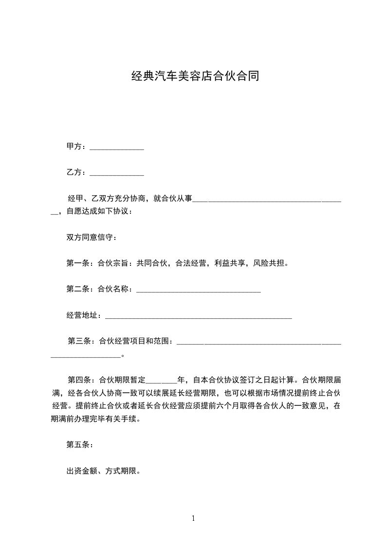 甲乙双方在平等自愿的基础上经充分协商,就合伙开办____________厂,明确合伙各方的权利与责任事宜,特订立以下协议条款共同执行。