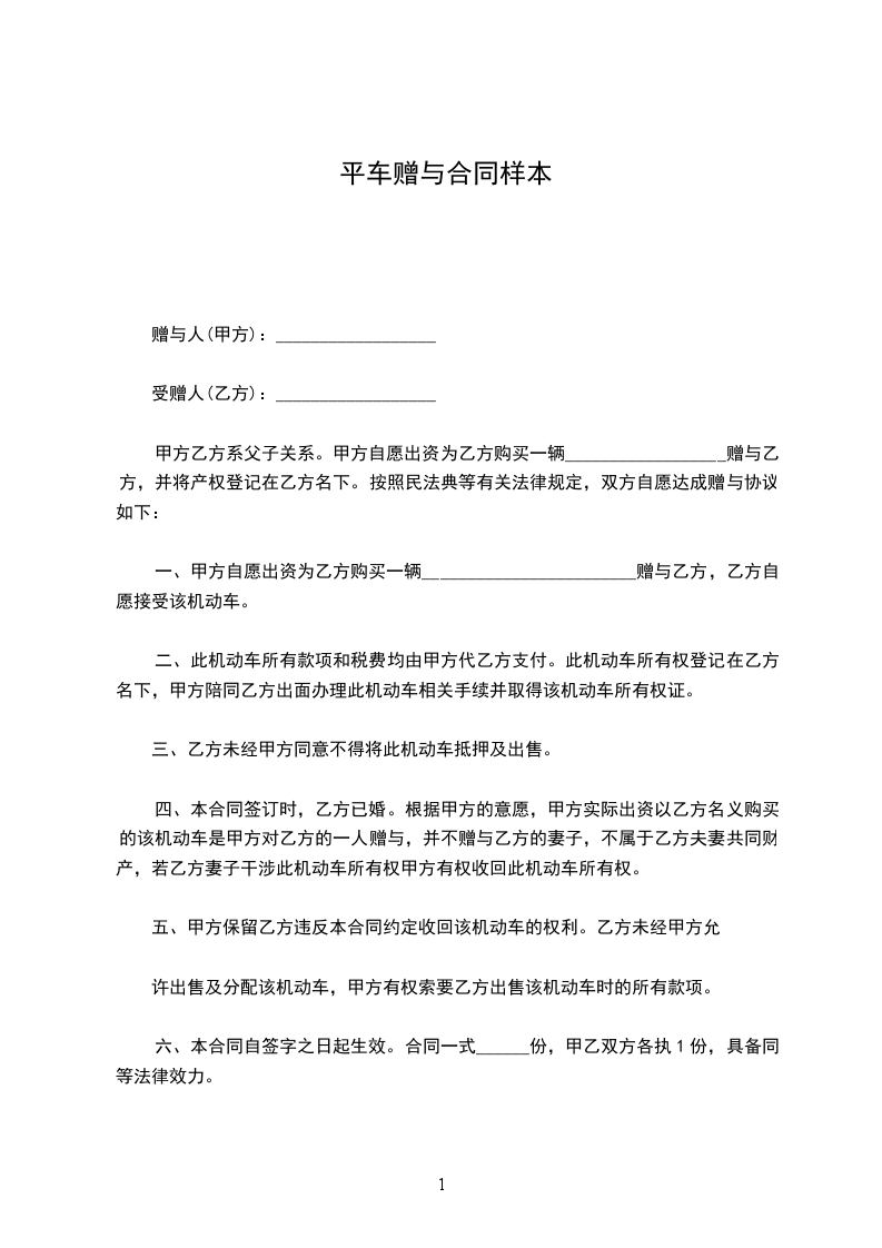 甲方乙方系父子关系。甲方自愿出资为乙方购买一辆__________________赠与乙方,并将产权登记在乙方名下。按照民法典等有关法律规定,双方自愿达成赠与协议如下: