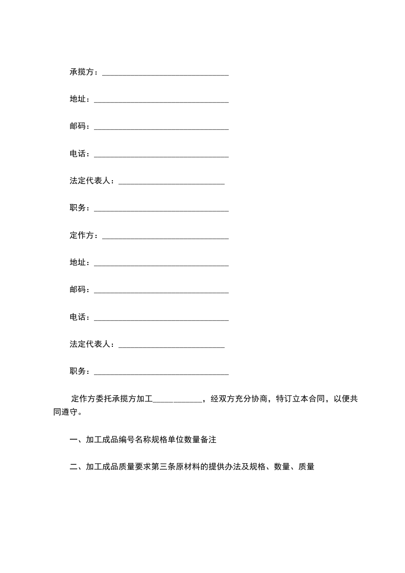 第三条:乙方所交的加工品应保质保量,并不得有短缺或不合规格及瑕疵等情况。加工完毕送货至甲方工厂,经过甲方初步验收后入库。(因甲方提供的物料本事质量问题,乙方应及时告知甲方,经过甲方确认,乙方不承担责任)