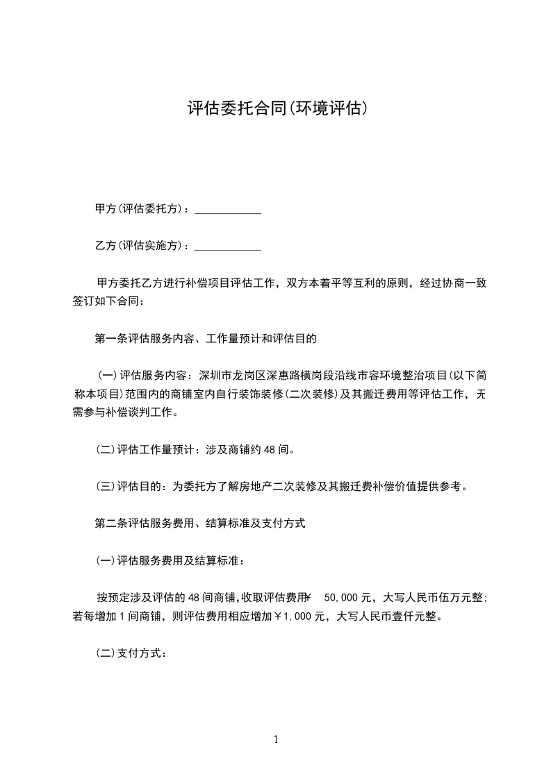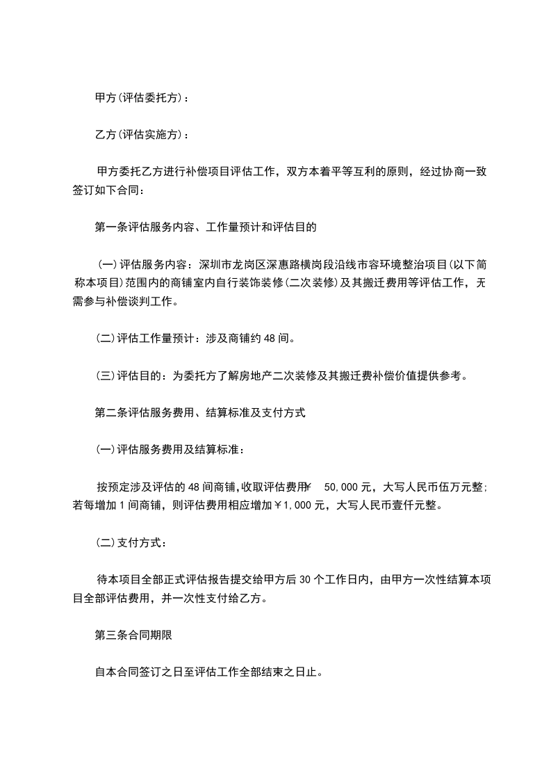 甲方委托乙方进行补偿项目评估工作,双方本着平等互利的原则,经过协商一致签订如下合同: