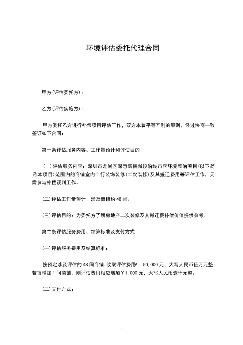 按预定涉及评估的48间商铺,收取评估费用¥50,000元,大写人民币伍万元整;若每增加1间商铺,则评估费用相应增加¥1,000元,大写人民币壹仟元整。