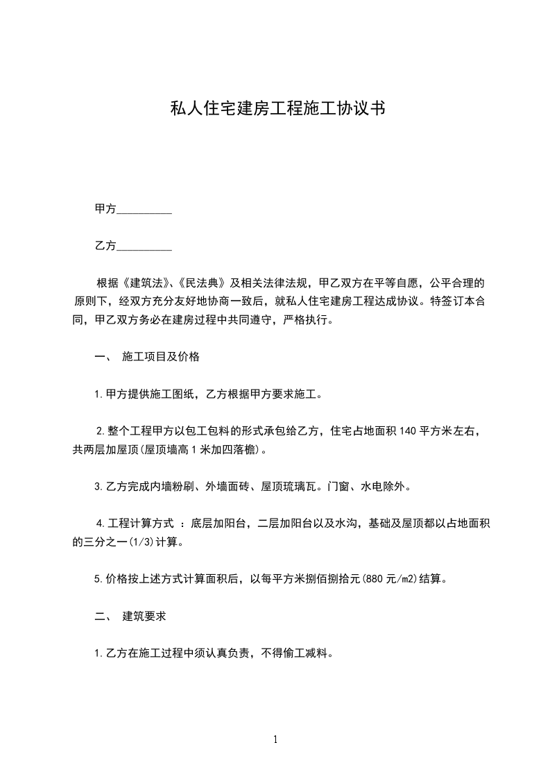 1、本工程按包工包料每平方700元人民币价格与乙方结算工程款。包括化粪池、水沟,上面楼梯房每一个补壹万元给乙方。